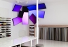 Система свободной установки, которая состоит из многоцветных светодиодных модулей, встроенных в звукопоглощающие тканевые панели, для отображения динамического контента и приглушения звука.