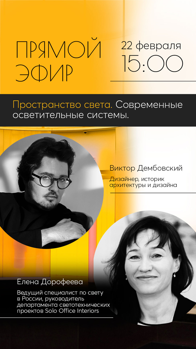 22 февраля 15:00 на прямом эфире с Виктором Дембовским и Еленой Дорофеевой поговорим о пространстве света и современных осветительных системах.